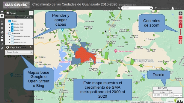 - Demográficos: En estos mapas se puede ver el crecimiento de la ciudad, la población y sus características (ejm cantidad de Hombres y mujeres) por localidad, manzana, AGEB, polígono de locaidad urbana. La información es de los censos de Población y vivienda del 2000, 2010 y 2020 del INEGI. También se han construido polígonos de igual tiempo (isócronas) desde Atotnilco o SMA centro caminado o en vehículo.